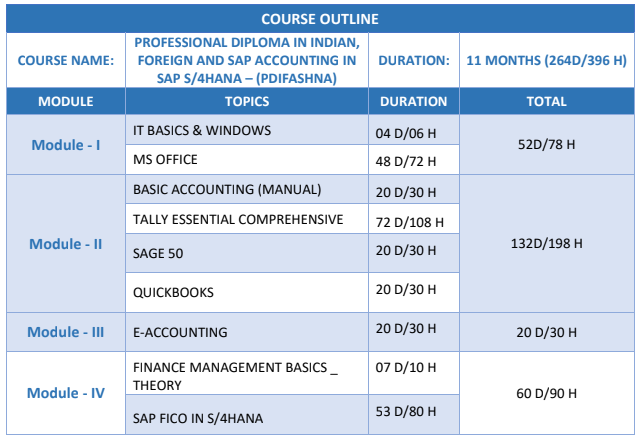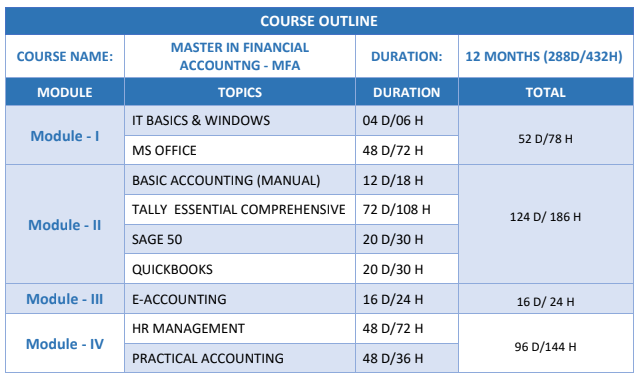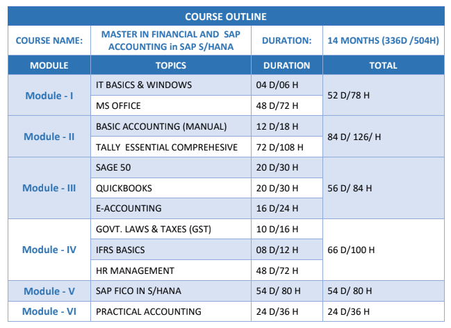The course modules are designed in such a way as to convert a novice to an expertise in financial accounting using any of the accounting software of his/her choice. The course starts with basics of computer, advanced through MS Office packages and enters into the world of accounting through Manual and Computerized accounting. The course is concluded with ONE of the most prestigious and most used accounting software available today.