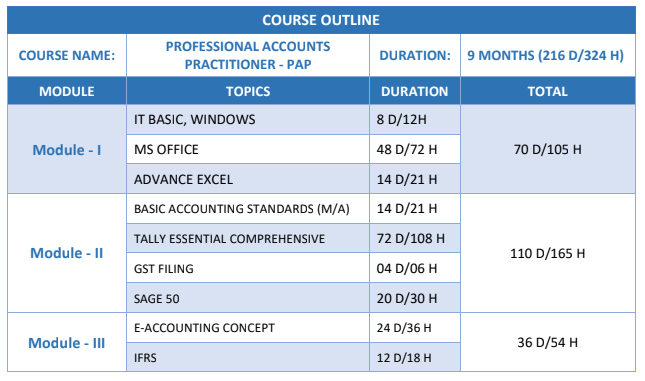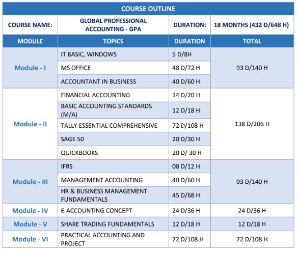 This course to make you a professional accountant recognized globally especially in GCC Region. The course starts with the very fundamentals of Computer, MS Office, Advance Excel and strides to manual accounting, computerized accounting, ERP & E – Accounting and reaches up to IFRS. You would experience the whole evolution of Accounting on your fingertips with PGA.