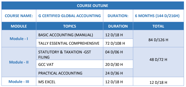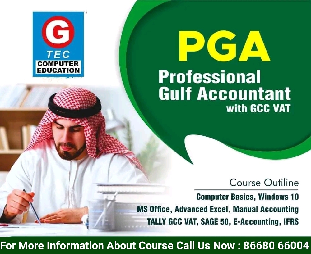 CGA, Certified Global Accountant is a professional course to make you a true accountant who can handle Indian and foreign accounting and taxation (VAT). Starting with Manual Accounting basics, MS Excel, Computerized accounting in Tally, the course strides to statutory and taxation including GCC VAT. The course ends with Practical accounting to make you confident to take up the job first day first hour. The course will make you special with Tally Direct Certification and G-TEC Global Certification.