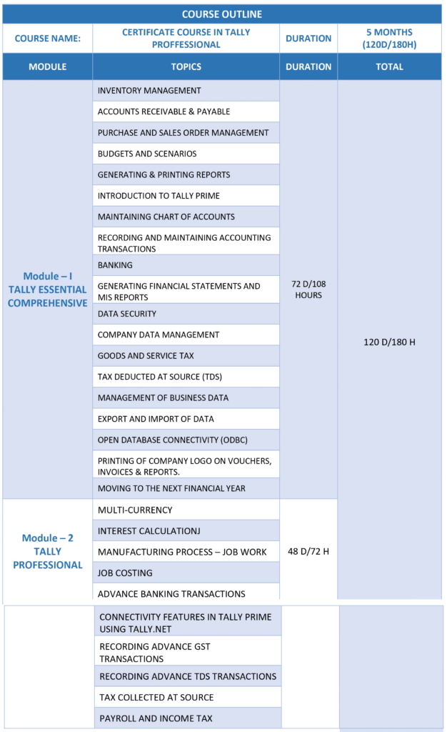It is a professional certification for candidate’s aspirant for their skill on Computerized Accounting and Tally with growing careers. It certifies candidates to have a better understanding of advanced accounting concepts through Tally and assists candidates to become job-ready.