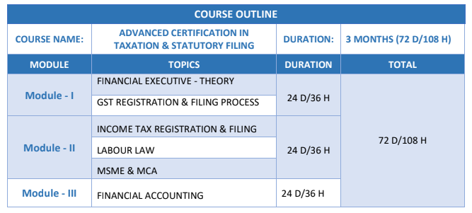 This course is a combination of taxation, Statutory compliance and financial accounting which has been designed to make a commerce student a commerce professional who can handle taxation and statutory compliance along with handling accounts using practical learning tools & simulation technology. Through hands-on exercises and practical challenges, students gain proficiency in accounting. “Taxation & Statutory filing Expert Accountant”.