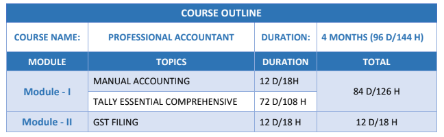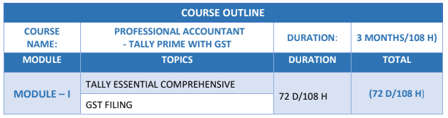 Professional Accountant, as its name denote is a practical training course on computerized accounting and taxation which most conventional accountants struggle with. The course starts with Computerized accounting in Tally latest version covering all three levels and ends with GST Filing. The course will make you special with Tally Direct Certification and G-TEC Global Certification.