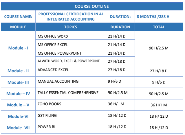 The Professional Certification in AI Integrated Accounting equips students with a comprehensive understanding of AI tools and their seamless integration within MS Office Tools (Word, Excel, PowerPoint). Students will learn to leverage AI for enhanced data analysis, presentation creation, document editing, and automation, empowering them with essential skills for various office-centric roles and automates routine tasks in Accounting Tools such as data entry and invoice processing, reducing the risk of human error and helping accountants focus on more value-driven activities.