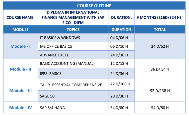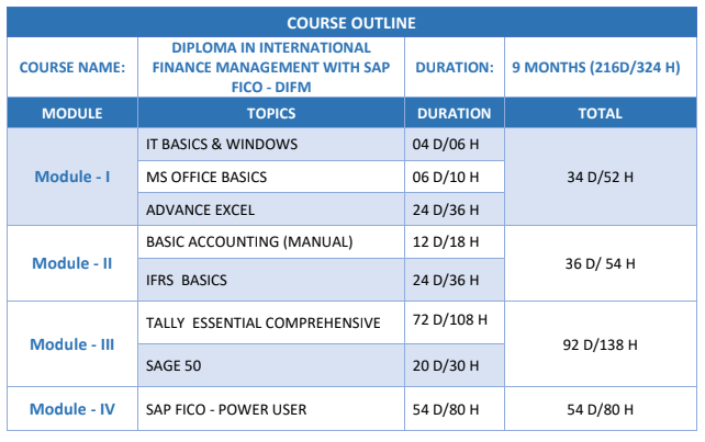 Shape your International career dreams in Accounting in the right hands. DIFM is on such rare blend of program which trains you to qualify job description laid out by any MNC out there. With IFRS backing your International Accounting standard proficiency, SAGE scaffolding your foreign accounting practice, Tally giving you a strong foundation in computerized accounting and SAP FICO exposing you to the world’s best ERP Accounting, you would remain UNEXPENDABLE in accounting industry.