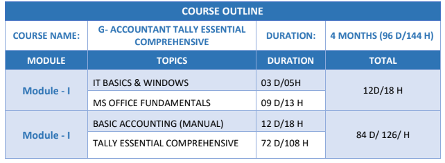 The course modules are designed in such a way as to convert a novice to an expertise in financial accounting using any of the accounting software of his/her choice. The course starts with IT basics, Windows and Internet with e-mail, advanced through MS Office packages and enters into the world of accounting through the latest Computerized accounting, Tally Prime, ONE of the most prestigious and most used accounting software available today. Finally, the course is concluded with Advance Excel.
