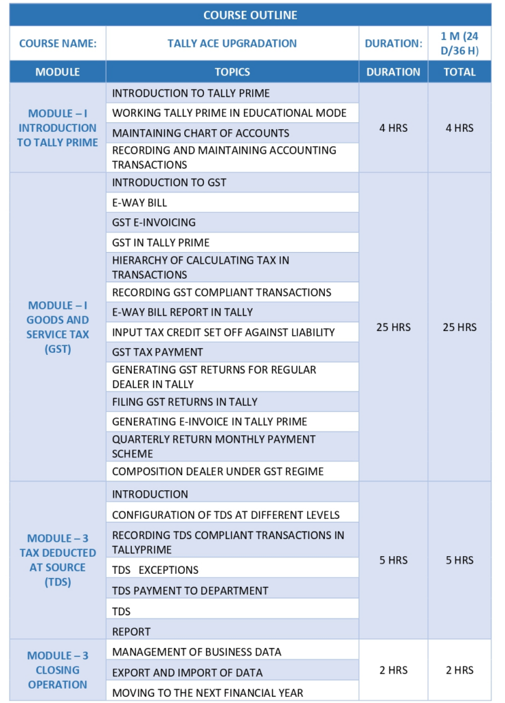 the statutory and taxation procedure. It begins with Goods and Service Tax and explain the various aspects of TDS and conclude with Company year-end process. This course gives an option to take a direct certification from Tally solution.